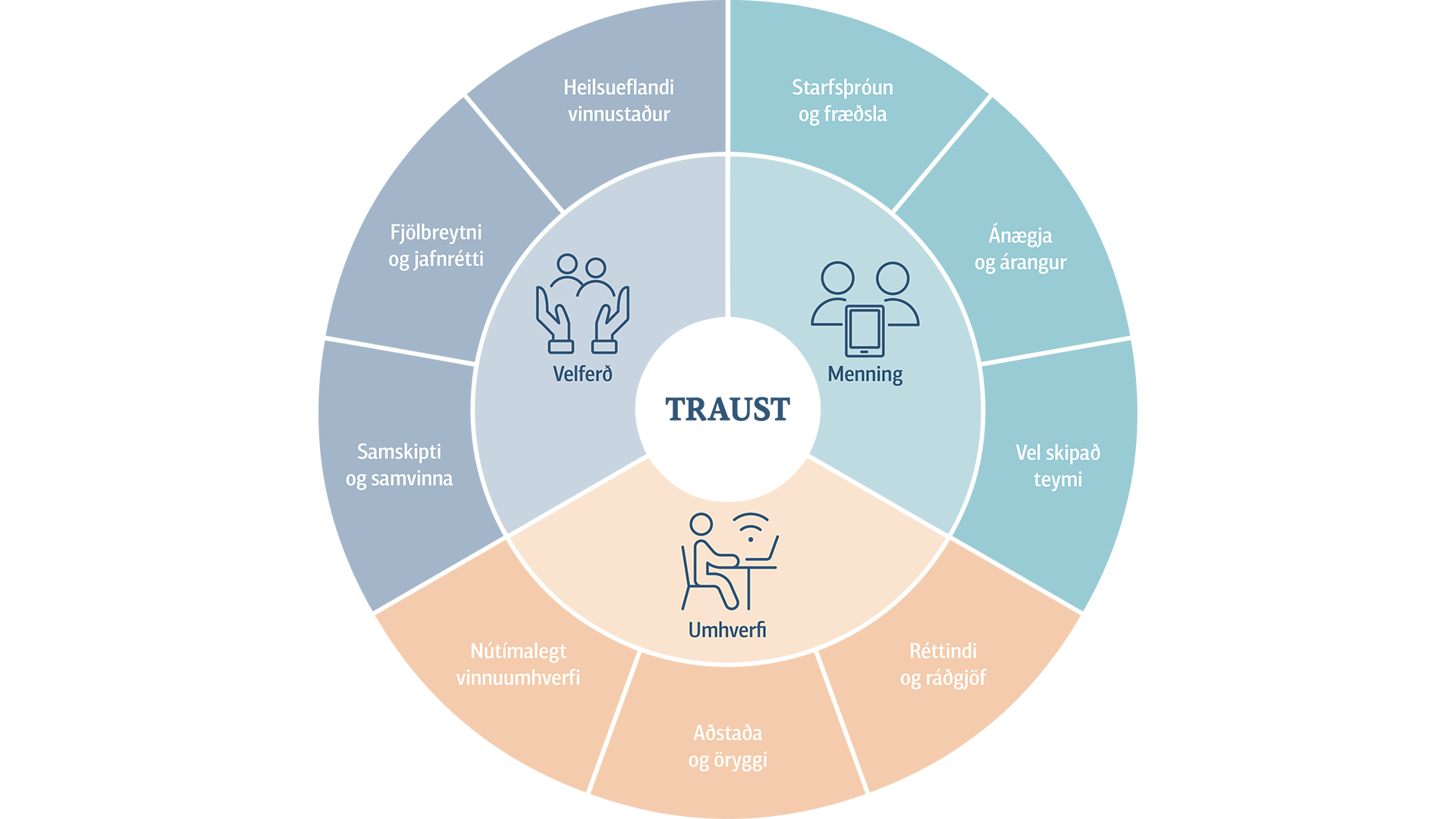 Stefnan byggir á þremur stoðum: menningu, umhverfi og velferð. Samhliða mannauðsstefnu var gefin út aðgerðaáætlun þar sem við tilgreinum verkefni sem styðja við einstaka þætti stefnunnar og einnig mælikvarða á árangur í hverjum hluta.